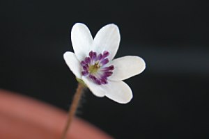 11月の状態のまま早春に蕾が見えていたので、花後に植え替えることにして花を見ることになった。 2003年3月25日初花をつける。 白の蕾も見えているので、1袋の中から2種類の花を見ることが出来そうでとても嬉しい。 初めて出会う花はとても可憐で感動を与えてくれた。 |