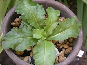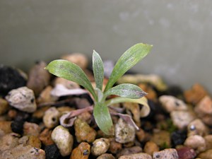 2003年3月11日桐生砂、蝦夷砂、硬質鹿沼土などの混合用土を、水洗いして播く。 霜よけと風除けをした場所で乾燥しないように注意し、3月中旬からは日光に当てて管理した。 少し遅い播種だったが4月16日に芽生えを確認、順調に生育する。 混んで芽生えたので、根に触れないようにマグアンプKを入れて7月1日仮植えをする。 |